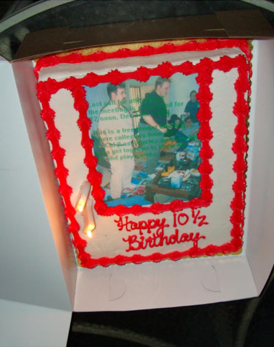 Halfway through the event, the picnic area received another delicious treat: SC3's 10th birthday cake! As hard as it is to believe, our group turned 10 years old at the end of 2008. The cake featured a photo from the early days: Geoff and Robert almost literally bringing down the house while playing Dance Dance Revolution. SC3 started as a small group of about eight SoCal console collectors gathering together to swap Vectrex carts and play Combat. Now we're at 140 gamers, some of whom flew out from the East Coast to attend, clustering around dozens of coin-ops and consoles and belting out Rock Band tunes for hours on end. Thanks to all those who attended and especially those who donated to the Kitty Jar. We just about broke even this time. With your continued donations, SC3 will be around for another 10 years!