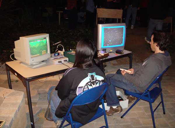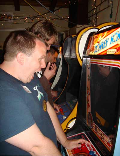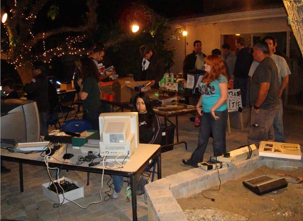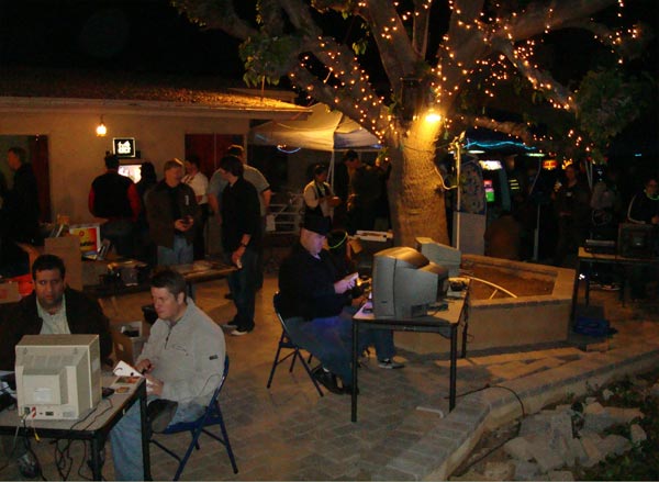 In show business, there's an old saying that a bad rehearsal leads to a great performance. This was certainly true for SC3's 10th anniversary party, held April 25, 2009, in Claremont, CA. Setup for this event was tricky. A snazzy new brickwork patio area was installed in our usual meeting place, but the construction ran long –workmen were busy fitting stones as late as the day before the event. That delayed our setup; we were moving arcade cabinets into place until the final minutes before the party began. Not only that, some of the machines weren't even working when we got started. Our movie screen got torn the night before the event. You'd think that after 10 years we'd have learned how to avoid these kinds of problems.