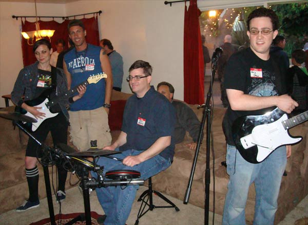 And arrive they did! About 140 people showed up over the course of the night, by far the biggest crowd we've ever had. At one point, we estimate that 120 people were there at the same time. But there was plenty of fun for every one of those 120. The garage arcade was at capacity all night, and the spectators around Rock Band and The Act were densely packed. We reorganized the patio arcade this time, opening additional paths for the crowd and better exposing the projected MAME/Visual Pinball/emulator setup, which was hopping until the very end of the event. Ten classic console systems, plus one 1982 Tron VFD handheld, were set up for those who prefer their gaming on vintage hardware.