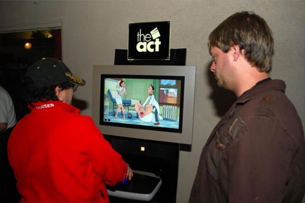 So that was the "bad rehearsal" part. But this performance ended up going off without a hitch, thanks largely to our friends Gary, Mitch, Jeff, Jason, Damon and Paul. Jason brought our dead cabinets back to life shortly before the event began. Paul brought additional machines, including Donkey Kong and the rarely-seen Escape from the Planet of the Robot Monsters, while Damon brought crowd-pleasers Trog and The Act, an incredibly rare, modern laserdisc-style prototype game. Along with Jeff, they helped us transport and move cabinets into the proper positions just minutes before things got started. We jury-rigged a new screen that actually turned out to be easier to set up than the old one. It was a lot of work, but somehow all the pieces fell into place just as the attendees started to arrive.