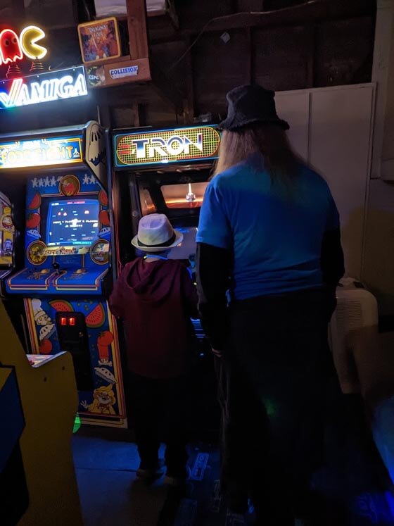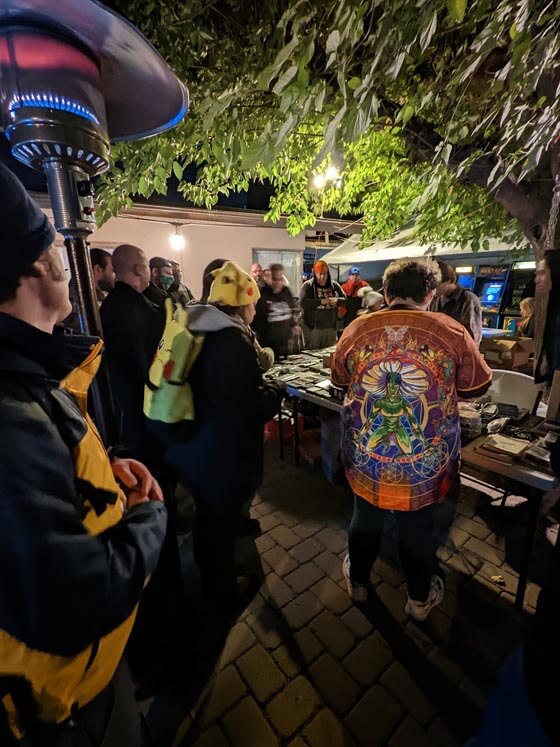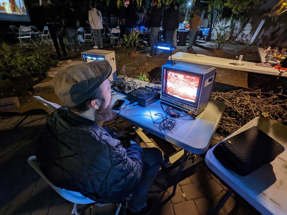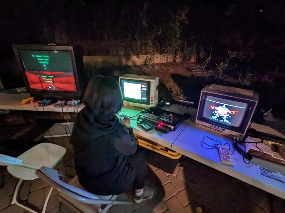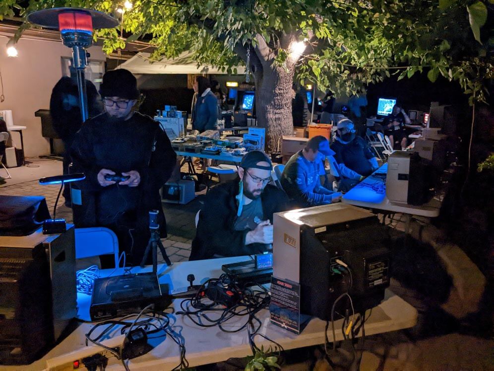 While vintage arcade machines are always on hand at our backyard events, this one was overloaded with home consoles, including another that made a return after a long absence: the Atari Jaguar. Atari's wildcat hadn't shown up at SC3 for a while but was back in full force, with multicart! Making its SC3 debut was an MSX2, the Japanese personal computer famous for launching Metal Gear and boasting unique games in the Castlevania and Xevious series. Rik from Handheld Games Museum brought his familiar parcel of '80s VFD mini-arcade machines, while William D. covered the large end of the screen-size scale with his NeoGeo AES setup. Altogether, the machines (and the rented patio heaters) kept the backyard warm on what was otherwise a very chilly evening.