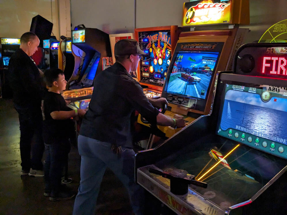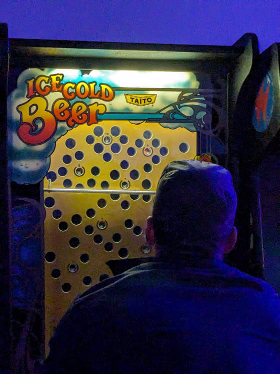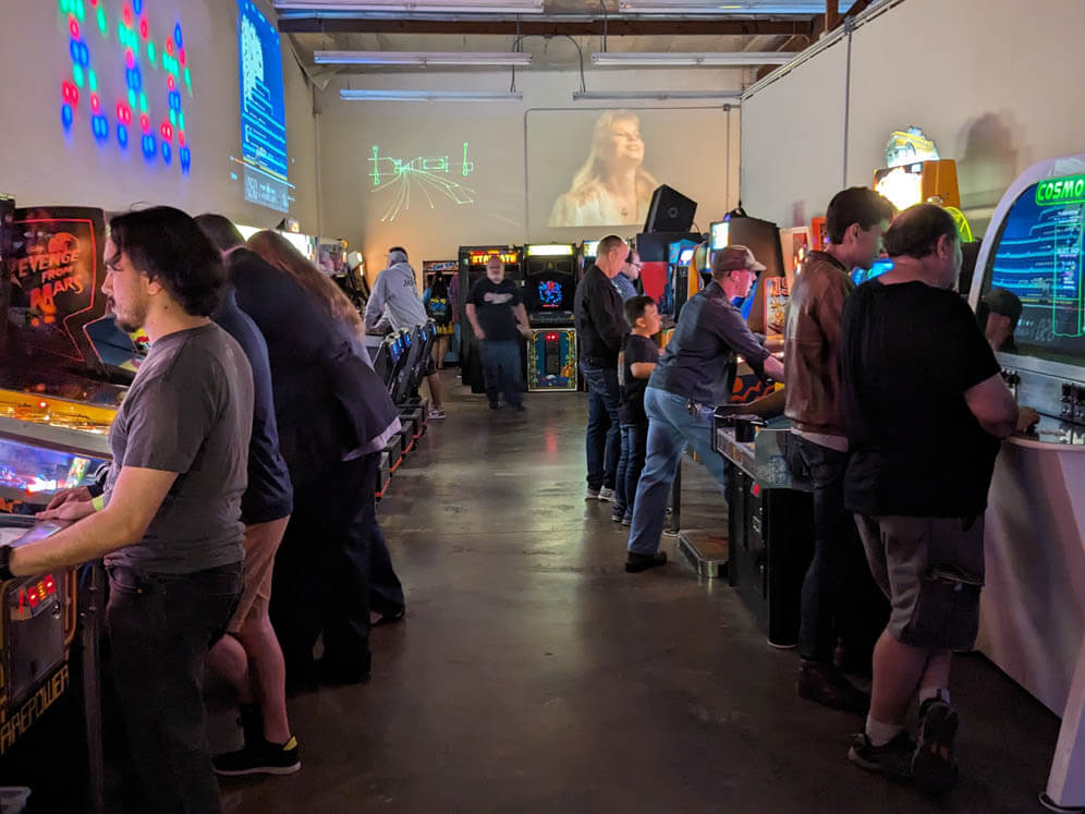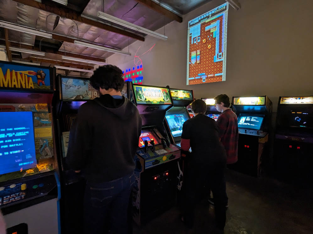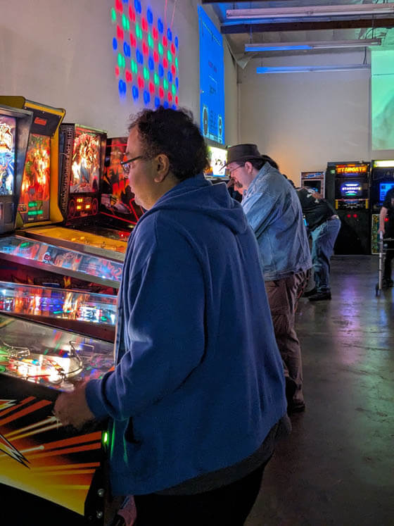 Despite all our grumbling above though, this event went smoothly. Y2Kade is a great place, and the owner (Jim) is always well-prepared. He had electricity provided and ready to go, even working with his neighbors to distibute the load to avoid power failures. The truly prodigious amount of machines are well kept and play beautifully. The SC3 organizers' main job was to bring a bunch of monitors and vintage consoles to complement the arcade and pinball experience Y2Kade provides. Our setup this time consisted of about a dozen machines, dating from the late '70s with Atari and Intellivision – through the turn of the 21st century with the Dreamcast. William D. also brought his always jaw-dropping NeoGeo setup. The home consoles received plenty of attention, with a raucous N64 Mario Party session lasting seemingly the entire evening!